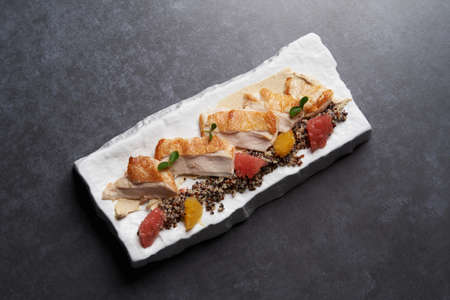 Citrus Chicken & Quinoa Salad. Chicken fillet slices with quinoa and grapefruit. Luxury restaurant seafood
