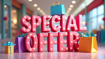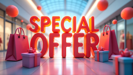 Vibrant SPECIAL OFFER in 3D with shopping bags and gift boxes against a colorful mall backdrop