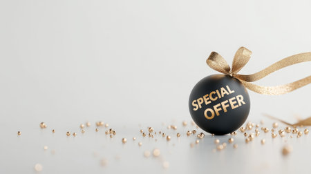 Black ornament with special offer text and golden ribbon in a minimalistic setting with scattered gold beads. Represents festive promotions or holiday sales.