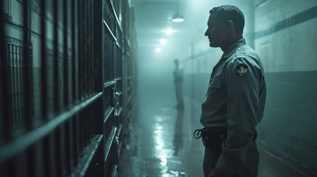 Female Prison Guard Standing Watch Over The Cell Block, Authenticity.