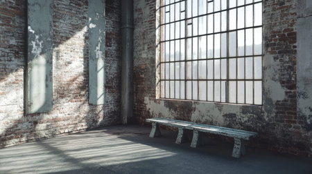 A serene and spacious urban industrial interior featuring natural light pouring through large windows onto rustic brick walls. Ideal for creative projects.