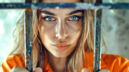 A young woman with bright eyes gazes intensely from behind metal bars, wearing an orange jumpsuit, conveying a sense of longing and resilience.