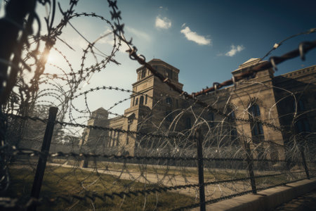 a tall chain-link fence topped with menacing barbed wire, encircling a secure facility. The composition conveys a strong sense of security and restriction