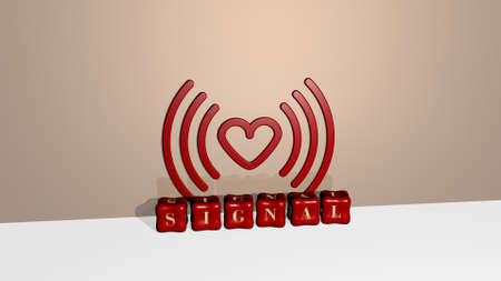 3D representation of SIGNAL with icon on the wall and text arranged by metallic cubic letters on a mirror floor for concept meaning and slideshow presentation. illustration and background