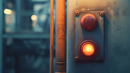 A vibrant red traffic light shines brightly in an urban setting, signaling vehicles to stop. The image captures the essence of city life during the evening, showcasing a safe and illuminated street environment.