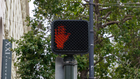 San Francisco, USA - August 2019: Stop Don't Walk Hand Up light at a crosswalk