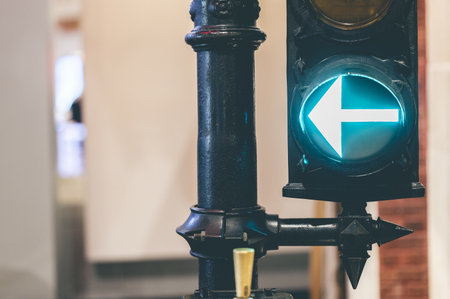 An image showcases a traffic signal with illuminated green and orange arrow lights. The composition highlights the signal's shape with an up arrow lit in green and an amber right-turn arrow, set against a blurred background. The scene suggests a nighttime setting with city lights, suitable for commercial or editorial applications.