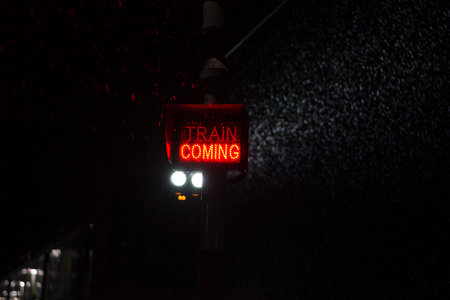 A traffic light mounted at a railway crossing, signaling an approaching train.