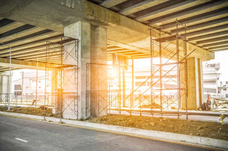 Construction of highway overpass bridge infrastructure in progress with morning sun rays in Malaysia