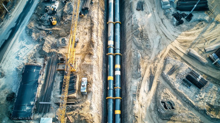Large oil and gas pipeline installation occurs in a trench, showcasing the expansive construction area and heavy machinery involved.