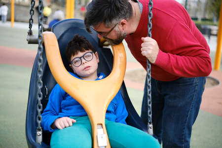Disabled boy and his father enjoy together while the kid swings on a special needs swing at the park.