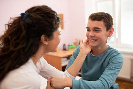 Mother sits with her son in the bedroom and gently touches his face and holds his hand while the son looks at her with a smile.
