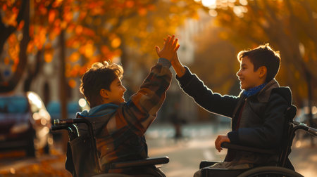 The concept of caring for and supporting disabled children. Two boys high-five each other while sitting in wheelchairs. The scene is lively and joyful, the boys show their excitement and happiness.