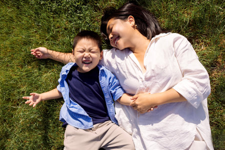 Asian laughing mom and son are lying on a green lawn. A smiling young woman and her cute kid are having fun on the grass. A mother and her child in casual clothes in a meadow. View from above.