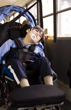 Disabled little boy sitting in wheelchair on school bus