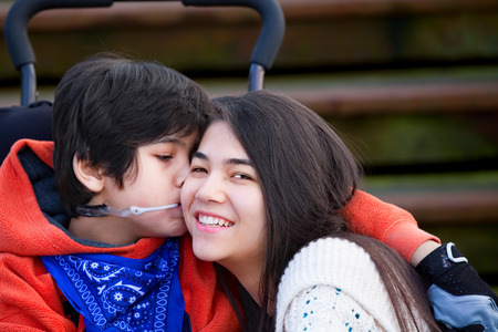 Disabled little boy kissing his big sister on cheek while seated in wheelchair