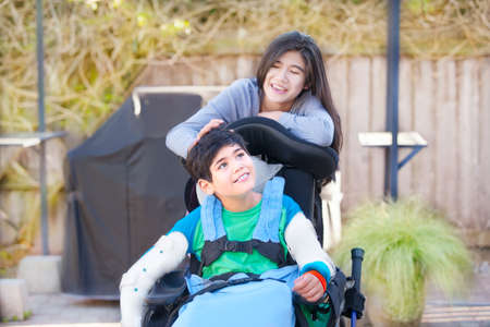 Teenage sister taking care of disabled brother in wheelchair outdoors, laughing and talking