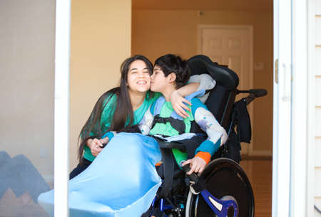 Sister kissing and hugging disabled little nine year old brother in wheelchair indoors