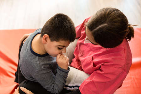 Asian mother comforting her son at home. Social distancing concept.