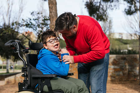 A little disabled boy in a wheelchair is happily ruling time with his father. The man helps him. The scene is bright and cheerful, the sun illuminates the boy and the man