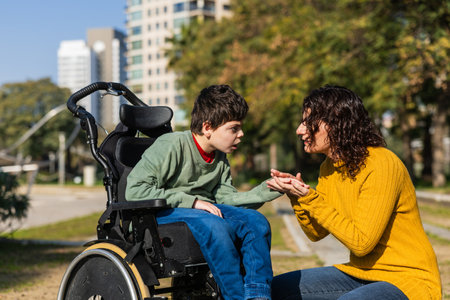 Mother comforting her son with disability in wheelchair in a park