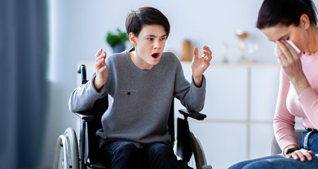Family conflict concept. Sad mother crying and her disabled teenage son in wheelchair shouting at her, indoors
