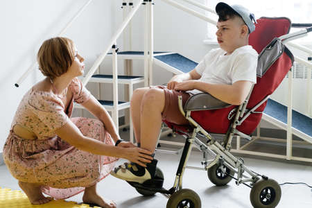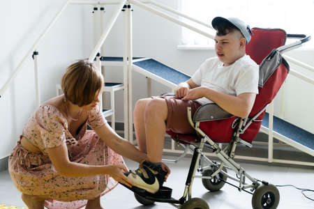 Mother helping disabled boy 17 years old in wheelchair with cerebral palsy to put on shoes, before going for a walk. Woman assists person with Special Need in rehabilitation canter. Inclusion, access