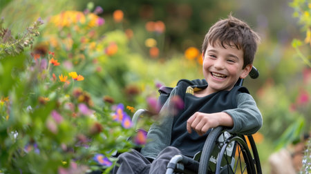 A young boy in a wheelchair exploring a garden filled with colorful flowers, surrounded by the vibrant sights and scents of nature.