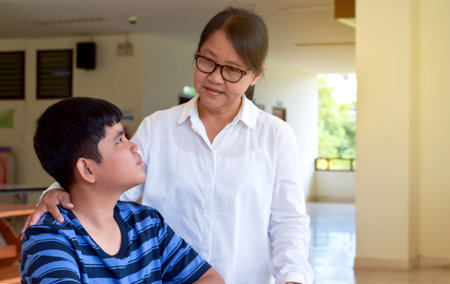 Children with disability have mobility problems. Mother carrying boy with cerebral palsy Woman assists and transport on chair. Rehabilitation center, mother with teenage person at home