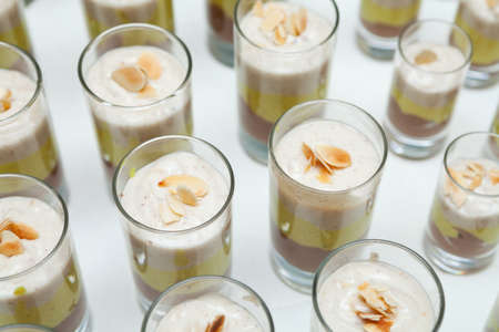 Chocolate, hazelnut and oatmeal cream sweetened with agave syrup decorated with almond slices (shallow focus)