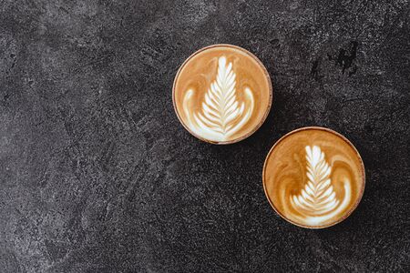Morning coffee in ceramic cups with foam and a pattern of plants leaf on marble table. Top view. Aroma fresh latte.