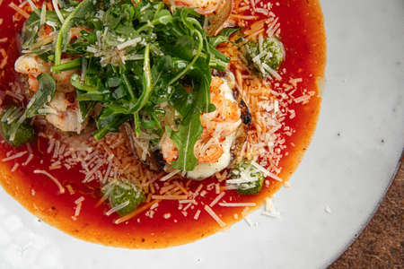 tomato soup with seafood on table