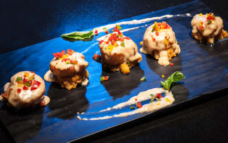 restaurant gourmet food on dark background. free space concept. delicious delicacy