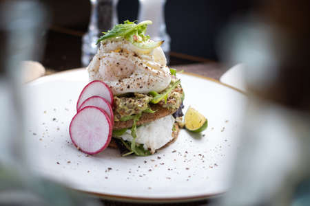 healthy fresh smoked salmon sandwich with egg and sour cream
