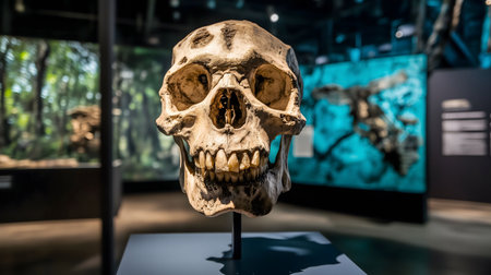 Human skull on display in a museum, providing a glimpse into the past