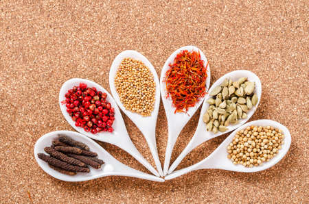 Assorted of spices in wooden spoon black pepper ,white pepper, black mustard,yellow mustard,fenugreek