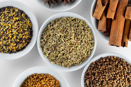 Different bowls with spices arranged in rows on white textured background, top view, selective focus. Some clipping path between them. Glass bowls with chilly, peppercorns, coriander opposite to clay bowls with cardamon and other spicies.