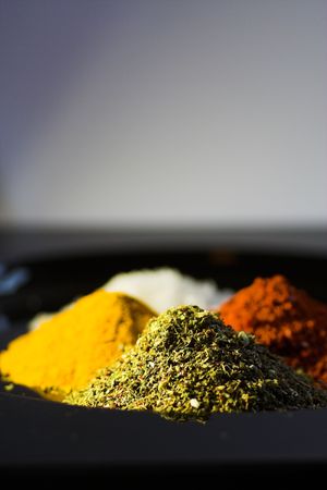 Colorful aromatic various spices for cooking on a black table, laid in spoons. Leaves of basil. Close-up