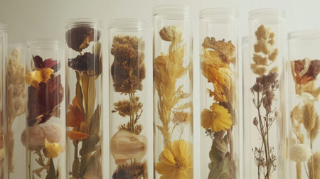 A captivating display of colorful dried flowers arranged in transparent glass test tubes, showcasing nature's beauty. Ideal for home decor inspiration.