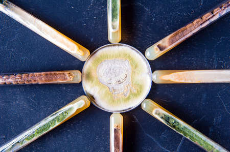 Slant tubes and petri dish with various mold strain cultures including neurospora intermedia, aspergillus niger and trichoderma