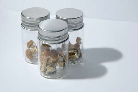 Psilocybin psychedelic magic mushrooms in glass jar on white background. Psilocybe shrooms