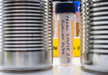 Fecal sample of a person infected with botulism, infection in tin cans in poor condition, conceptual image