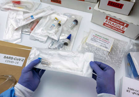 Nurse unpacking box with Covid-19 PCR kit in hospital warehouse, conceptual image