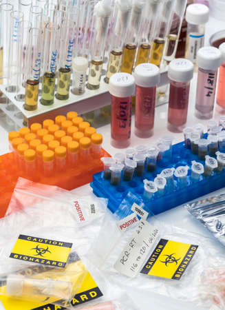 Vials with samples of SARS-COV-2 Covid-19 in a research laboratory, conceptual image
