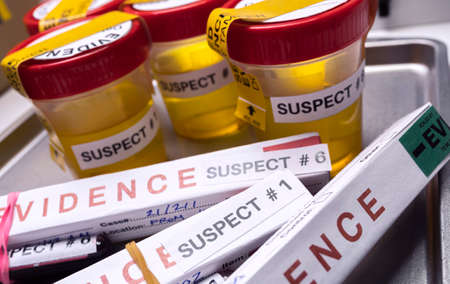 Various analyses of urine, saliva and blood of homicide suspects in crime lab, conceptual image.