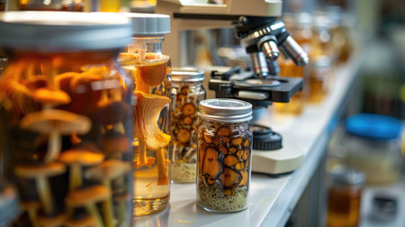 A modern scientific lab with a microscope, small jars of amanita mushrooms for research purposes.
