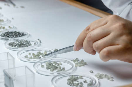 The process of manual sorting of diamonds. Gemstones are graded by quality and weight