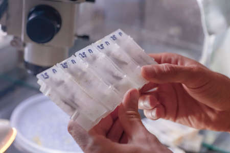 Lab technician takes sample from tube for test, close up, soft focus