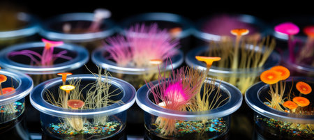 microbial cultures and petri dishes, surrounded by intricate drawings of microscopic organisms, created with generative ai