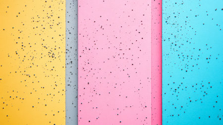 Brightly colored surfaces in yellow, pink, and blue showcase a speckled texture, creating an eye-catching decorative design.